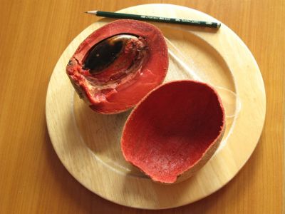 Hinweis: Das Fruchtfleisch enthält ein klebriges Harz, das nicht wasserlöslich ist und sich gerne an dem zum Essen benutzten Löffel niederschlägt. Es läßt sich mit ein paar Tropfen Pflanzenöl auflösen. Anschließend entfernt man das Öl mit einem geeigneten Tensid oder Bindemittel.